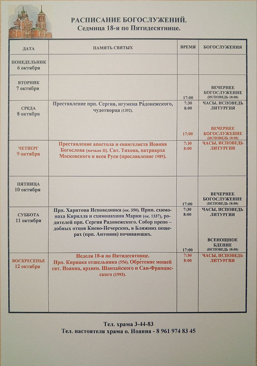 РАСПИСАНИЕ БОГОСЛУЖЕНИЙ