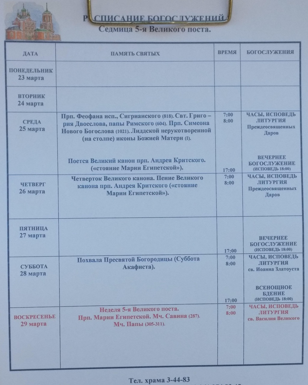 РАСПИСАНИЕ БОГОСЛУЖЕНИЙ